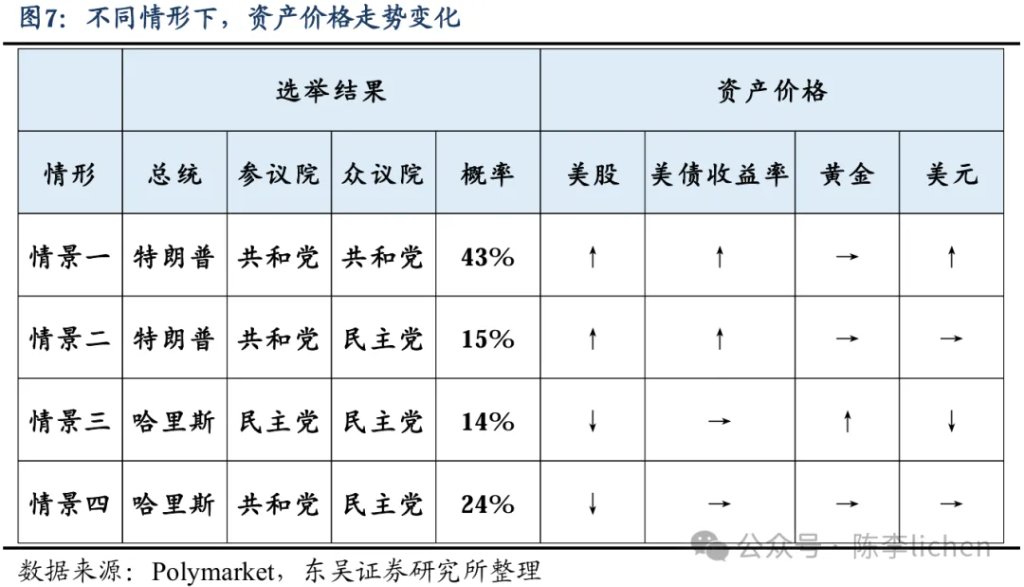 我们根据博彩赔率(一是敏感性更强,二是指向性更明显),按照总统党派,梳理了四种情形,并演绎其对资产价格的影响: