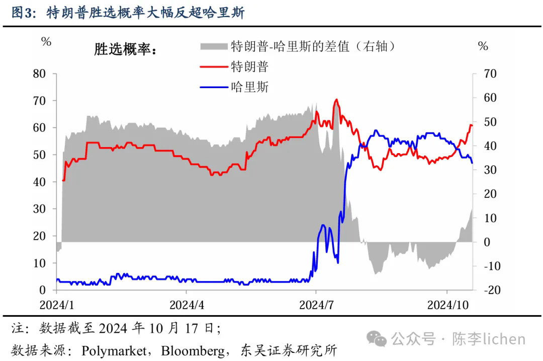 当前特朗普获胜概率远超哈里斯。从对市场反映更敏锐的博彩polymarket数据来看,市场预期特朗胜选概率更高,截至10月17日,特朗普获胜概率大幅回升至61%,超过哈里斯12个百分点。