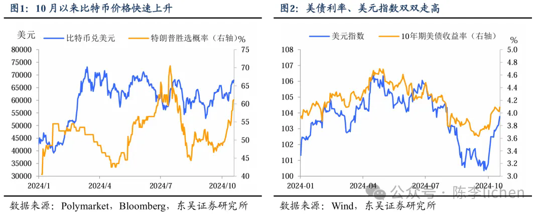 比特币、美元指数双双走强,美债利率上升,反映出市场特朗普2.0重新推高通胀的预期,金融市场重新定价特朗普上台。