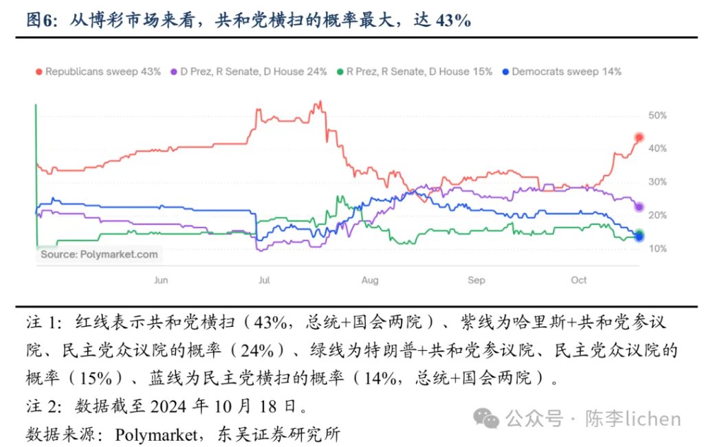 东吴证券认为,以当前市场判断来看,共和党“横扫”概率最大。如果共和党横扫,则美股美元黄金美债,更多“美国优先”政策利好美股;政策共振增加美国再通胀压力,潜在影响上利多美元;美债市场将遭到抛售长端的压力。